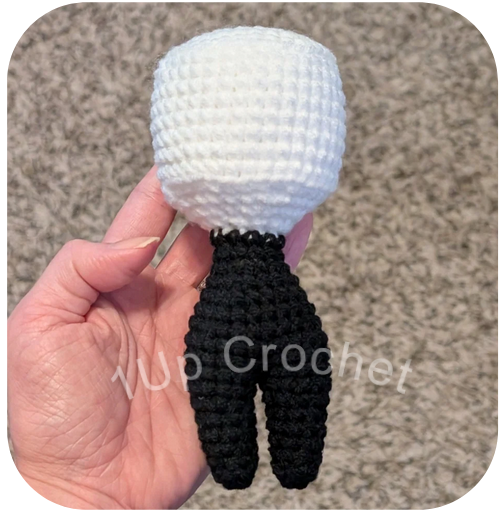 To form the body, we will join the two legs together, crocheting them into one piece. With the 2nd leg still on your hook, insert your hook through the last stitch made on the 1st leg and make a sc stitch. This will join the two legs together. Continue to crochet around both legs. See images above for guidance.
