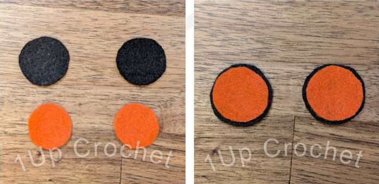 From a sheet of orange craft felt, cut out two small circles that are slightly smaller than the black circles so that when they are layered over the black, you can see a small outline of black.