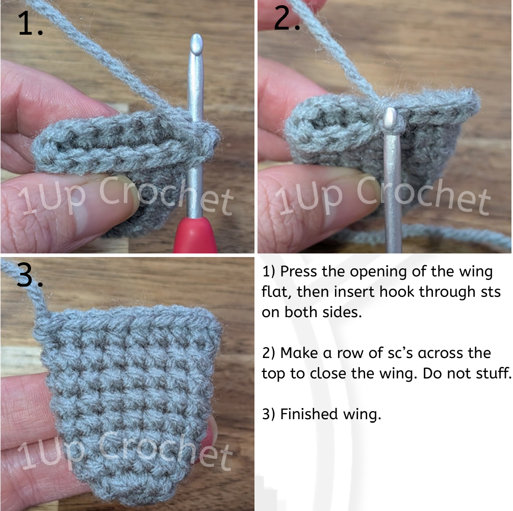 Chain 1, then press the opening flat. Do not stuff. Insert hook through stitches on both sides and make a row of scās to the end. (The same method that was used to close the wing.)